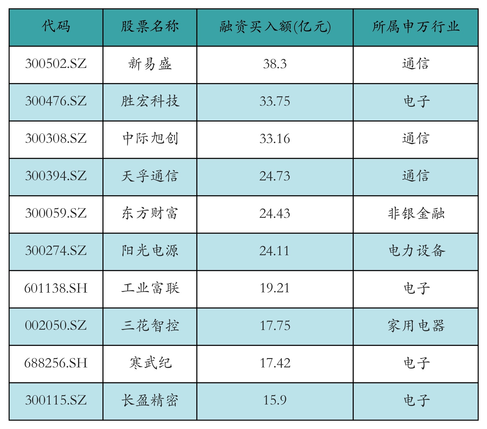 两市共有3460只个股有融资资金买入,其中新易盛、胜宏科技、中际旭创排名前三,买入金额分别38.3亿元、33.75亿元、33.16亿元。融资买入额前10个股详情见下表:
