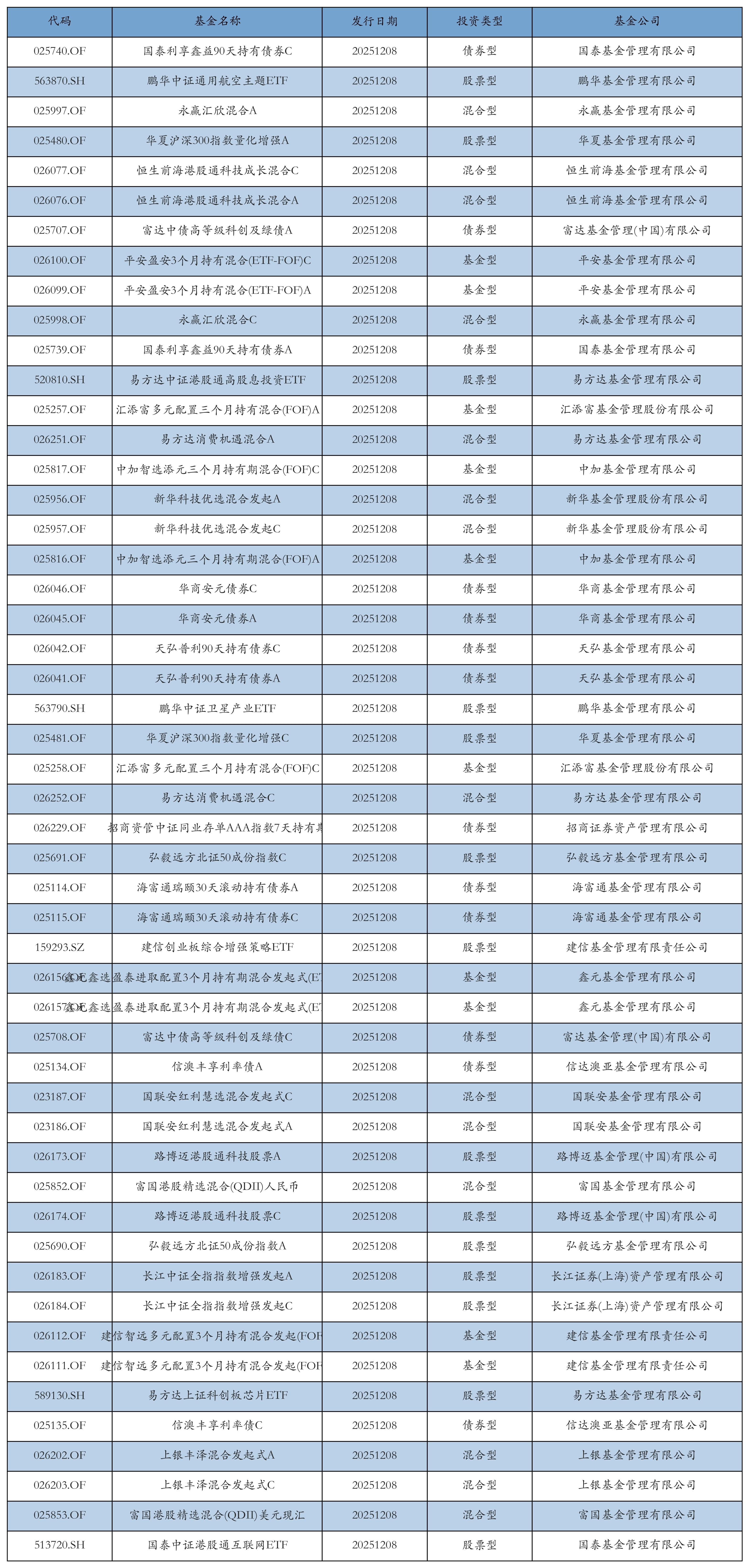 昨日有51只新基金发行,分别为:国泰利享鑫益90天持有债券C、鹏华中证通用航空主题ETF、永赢汇欣混合A、华夏沪深300指数量化增强A、恒生前海港股通科技成长混合C、恒生前海港股通科技成长混合A、富达中债高等级科创及绿债A、平安盈安3个月持有混合(ETF-FOF)C、平安盈安3个月持有混合(ETF-FOF)A、永赢汇欣混合C、国泰利享鑫益90天持有债券A等,详情见下表: