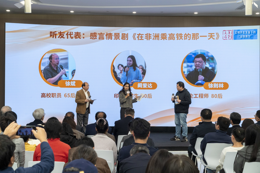 10. 听友代表徐斌、徐则林、阚爱达(印度留学生)表演感言情景剧《在非洲乘高铁的那一天》,融入了十期的听后感:全球南方打破西方话语垄断、在地化民生助推、AI人才培训规划等。