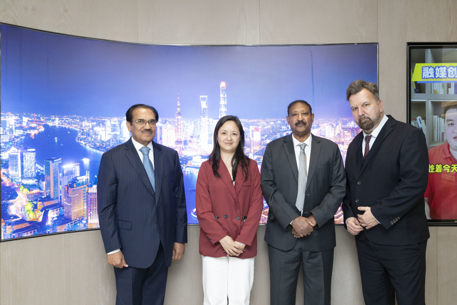 12. 讲座结束后,三位全球南方嘉宾在二楼融媒空间的IP演播室接受了讲堂的专题访谈,并在上海滩背景前与全球南方系列讲座总策划者与实践者、文汇讲堂工作室主编李念合影。
