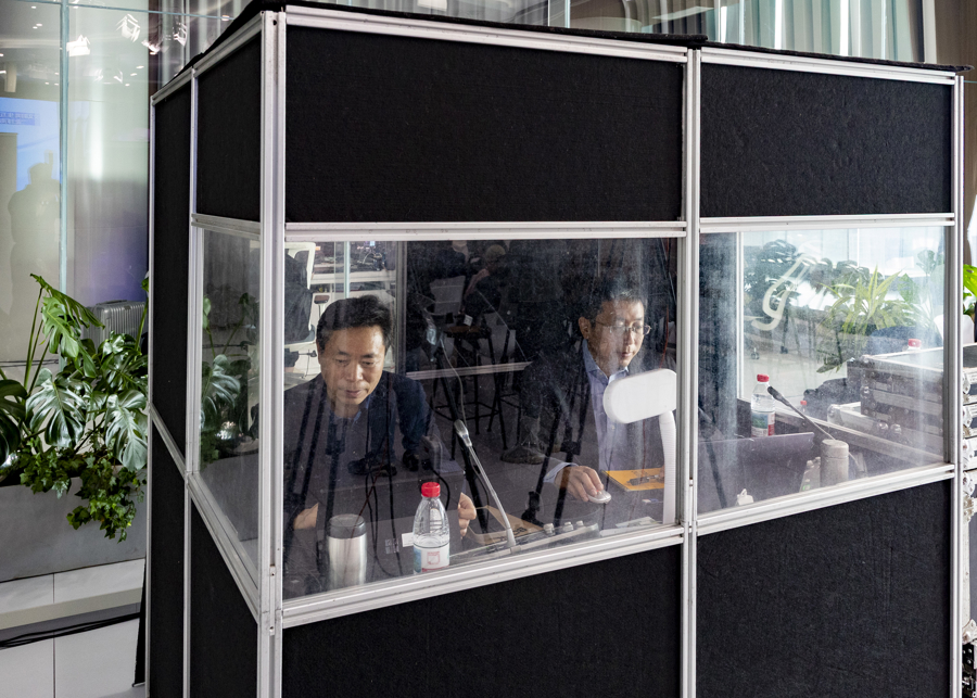 6. 十期讲座中涉及六期同翻,图为四次担任同翻的上海社科院梅俊杰教授和搭档复旦王炎强。上观App直播平台回看中有六期设有英文频道。