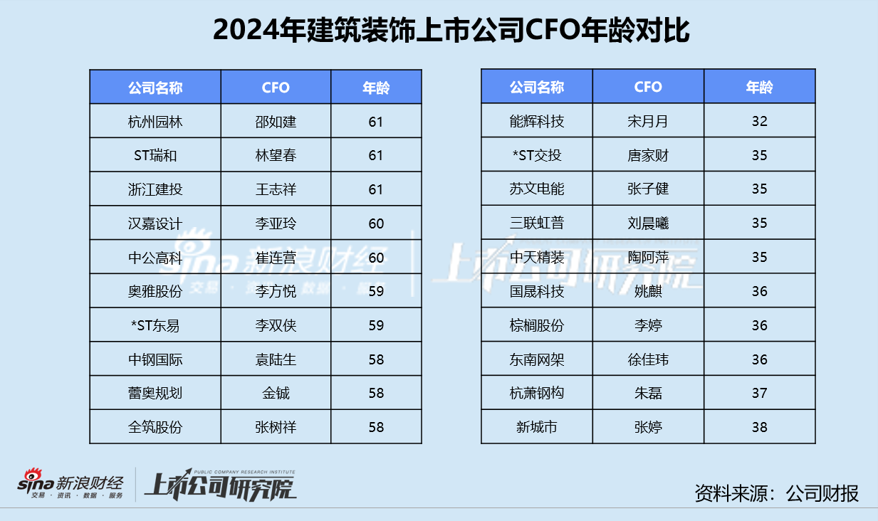 年龄最大的男性CFO为供职于杭州园林的邵如建、浙江建投的王志祥,两位现均已61岁。ST瑞和的女性CFO林望春目前也是61岁,在公司担任董事、副总经理、财务总监。能辉科技的董事、财务总监宋月月年龄最小,仅为32岁。