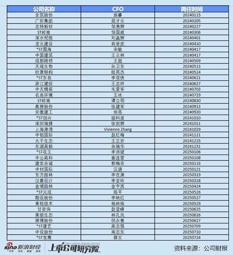 统计区间内,共有40位CFO辞职离任,健康和工作调动为主要原因,约47.5%已由继任者接任。中材国际、青矩技术、汉嘉设计、东湖高新等22家公司财务总监于2024年6月至2025年7月期间离职,暂时未找到接任者。